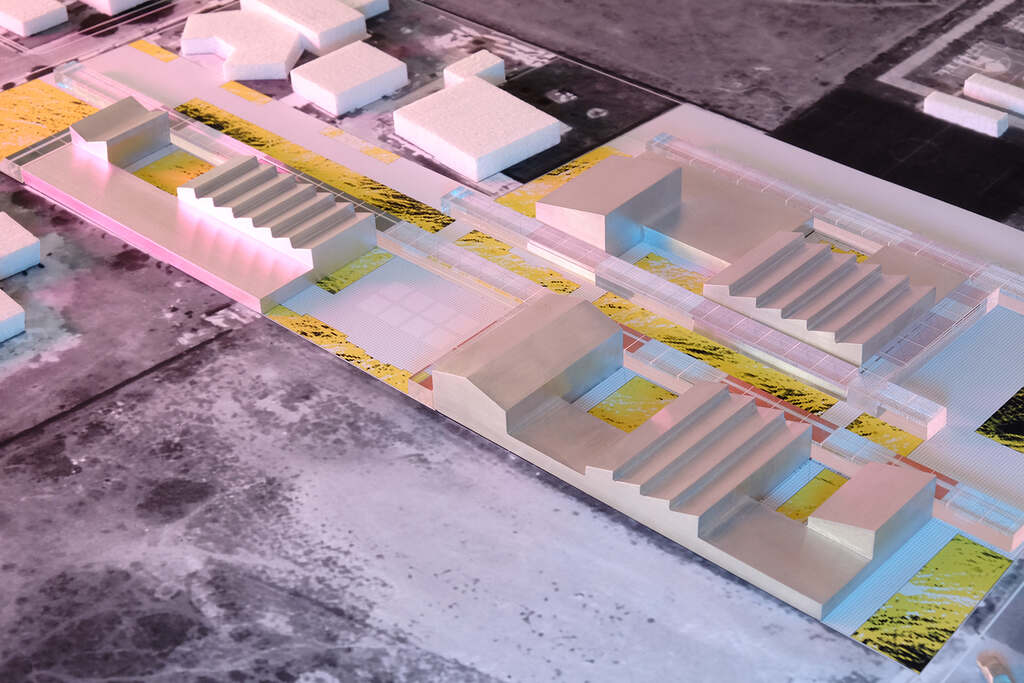 The Elena Poniatowska Agora and Library is a 222-meter-long public complex located just north of Mexico City, 10km away from the new Felipe Ángeles International Airport (AIFA). The project inserts a new pedestrian axis within an existing superblock-sized urban parcel, and contains a range of public programs relating to healthcare, arts, culture, and education. The pedestrian axis functions as both urban plaza and park. Arid gardens, seating, and lightweight metal pergolas cut down the site north to south and link to three new single-level buildings.