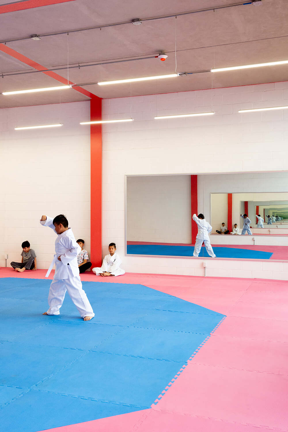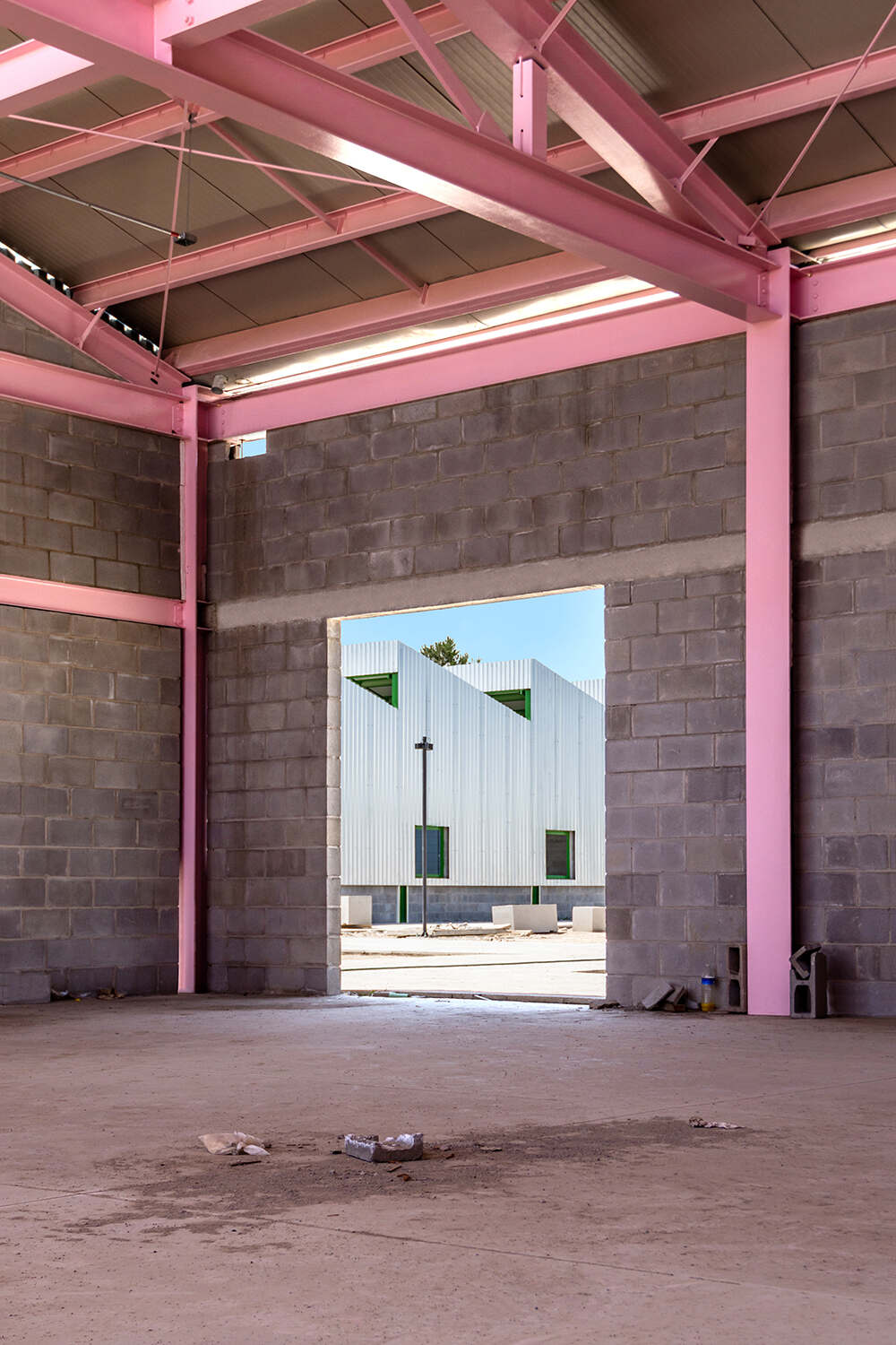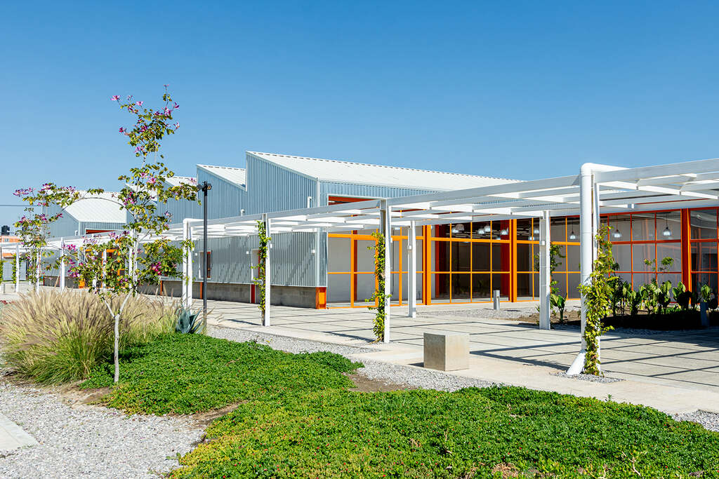 Taking cues from the industrial warehouse typologies of Tultitlán, the new buildings are based on a 5mx5m structural module that provides internal flexibility and supports future adaptations. The intense sunlight of the region is controlled and filtered to interior spaces through a series of skylights and courtyards. Corrugated metal sheeting uniformly wraps the exterior facades and playful sawtooth roof variations are placed in relationship to major programs. The interior steel structure of each building is highlighted with a unique color as a way-finding device: green for the social services and medical center; orange for the library and adjacent auditorium; and light pink for the arts and culture hub.