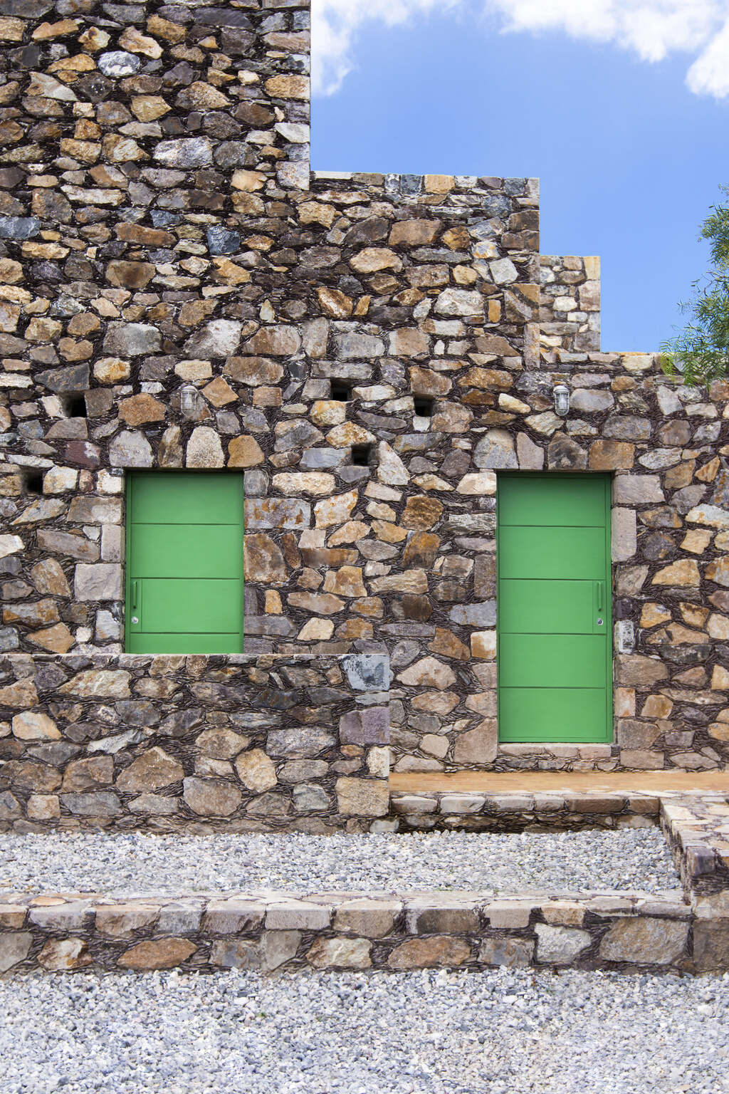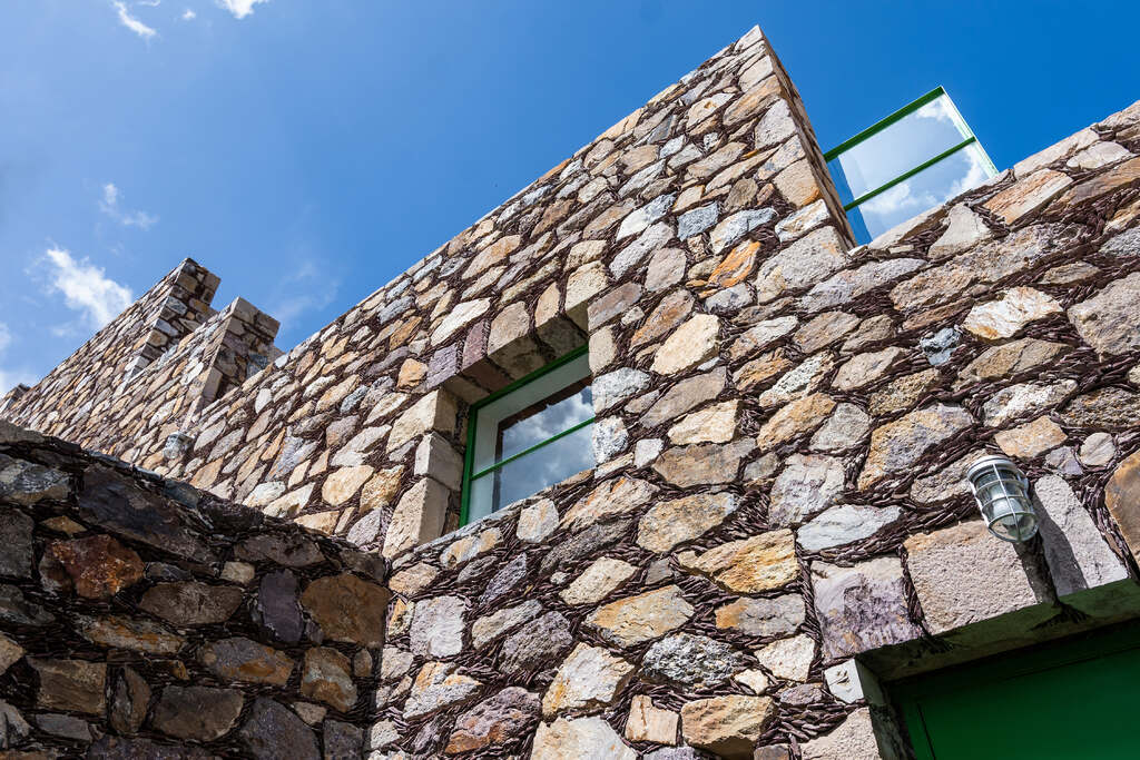 Located in Real de Catorce, a historic silver mining town established in the late 1700’s, Casa Georgina complies with strict building regulations that aim to maintain the site’s unique aesthetic character and architectural identity. In addition to height and sight-line restrictions, building mandates specify that all exterior walls be constructed with local stone, through a traditional building technique that is representative of the town. In tandem with the schematic development of the project, these building regulations initiated immediate design considerations at the scale of the detail. This included the repair, reinforcement, and extension of existing, solid stone walls on site, as well as the construction of new walls using a modified and more economical construction method involving stone, cast concrete, and CMU blocks.