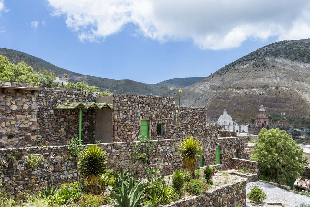 Localizado en Real de Catorce, un antiguo pueblo minero fundado durante el siglo XVIII para llevar a cabo la sustracción de plata, el proyecto cumple con las estrictas regulaciones de construcción locales y fue revisado públicamente por una junta supervisora. Además de temas de altura y restricciones de líneas de visión, las regulaciones de construcción especifican que todos los muros exteriores deben ser construidos con piedra local por medio de un sistema constructivo tradicional representativo del pueblo. En paralelo al desarrollo esquemático del proyecto, dichas regulaciones de construcción iniciaron consideraciones de diseño inmediatas que lo impactaron hasta la escala del detalle. Esto incluyó la reparación, reforzamiento y expansión de muros sólidos de piedra existentes en el sitio, así como también la construcción de nuevos muros utilizando un método de construcción modificado y más económico, el cual utiliza piedra, cemento colado y bloques de cemento.