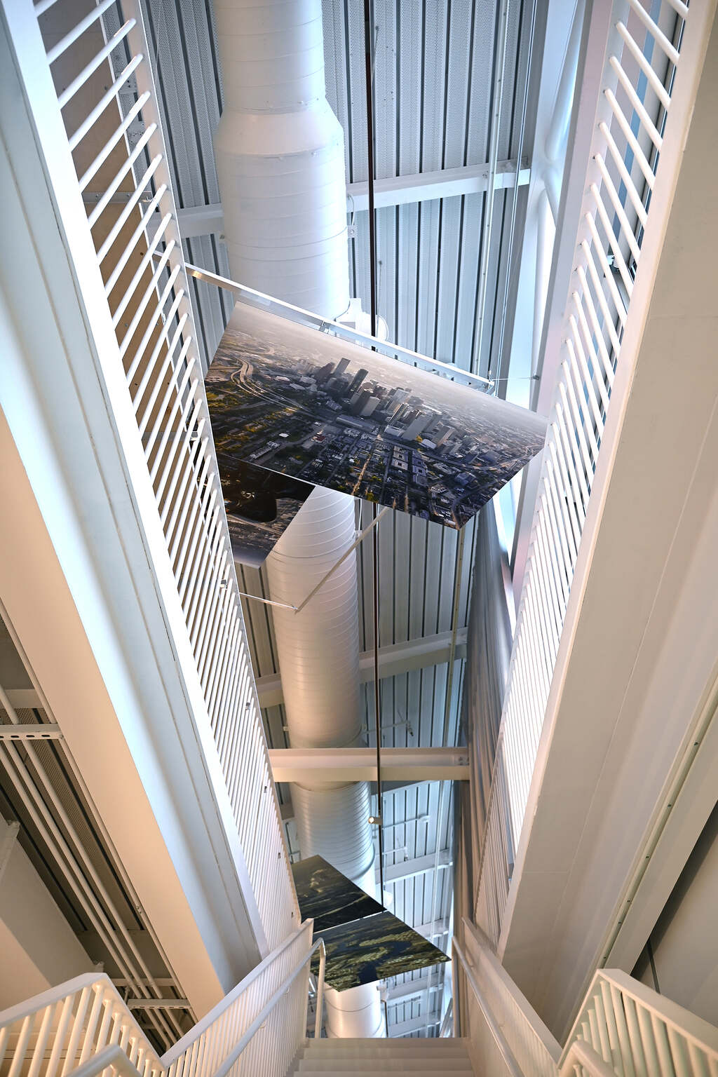 The second-floor features thirty images at a large, immersive scale, hung from custom aluminum frames that tilt and skew across the gallery. Baan’s photographs are suspended in various positions of flight. Some detach slightly from gallery walls whiles others float overhead, prompting visitors to assume new viewing positions and vantage points. A linear display table, fixed along the length of the central stair railing, contains a series of archival images from the Texas Department of Transportation. The black and white photographs, many of them taken by anonymous government workers, document the construction of Houston infrastructure projects from the early twentieth-century through the 1970s.