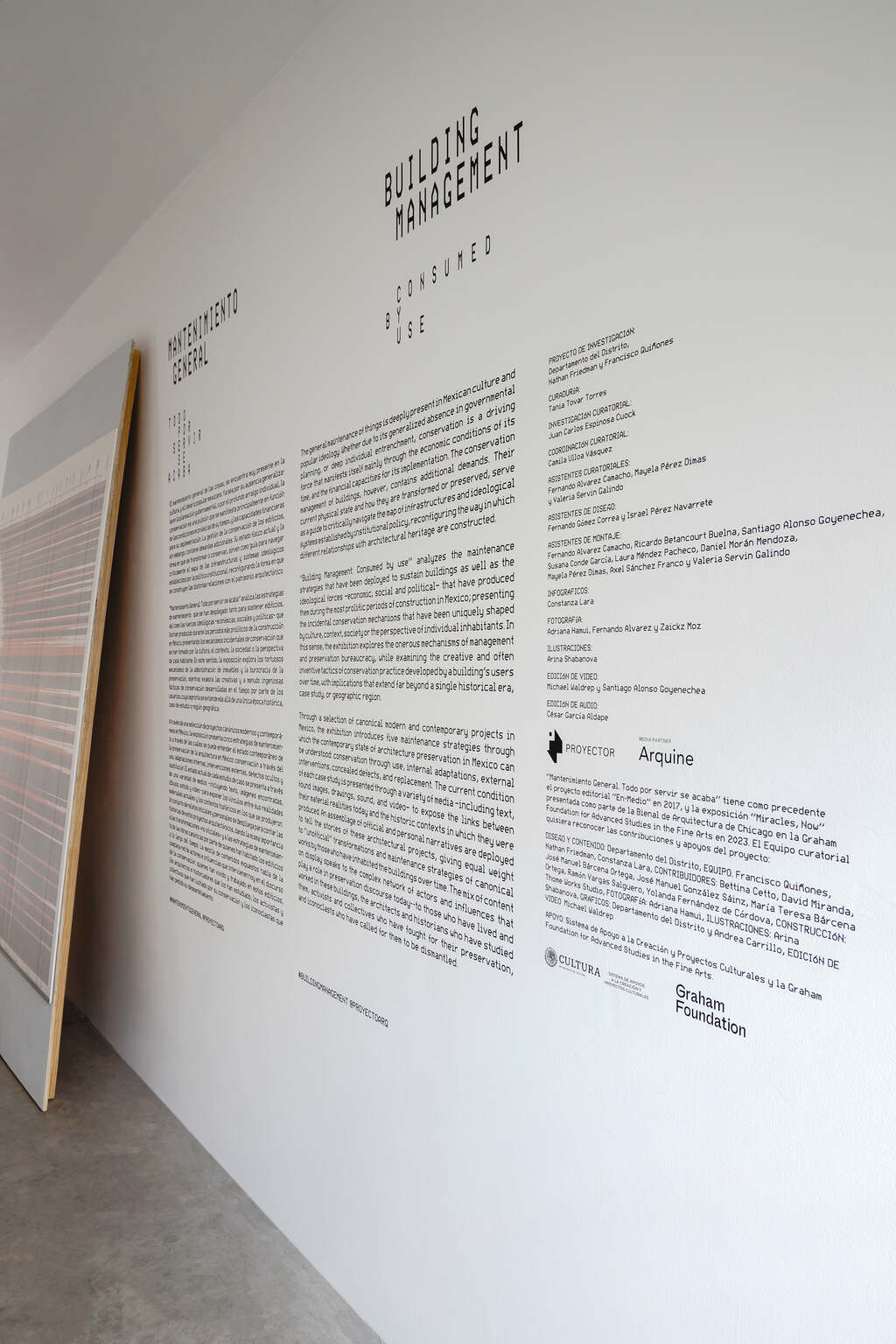 Mantenimiento General: Todo por servir se acaba analyzes the maintenance strategies that have been deployed to sustain buildings as well as the ideological forces—economic, social and political—that have produced them during the most prolific periods of construction in Mexico; presenting the incidental conservation mechanisms that have been uniquely shaped by culture, context, society or the perspective of individual inhabitants. In this sense, the exhibition explores the onerous mechanisms of management and preservation bureaucracy, while examining the creative and often inventive tactics of conservation practice developed by a building's users over time, with implications that extend far beyond a single historical era, case study, or geographic region.