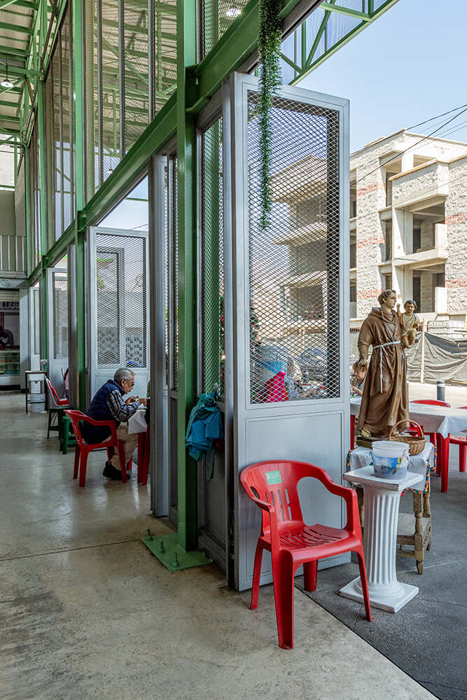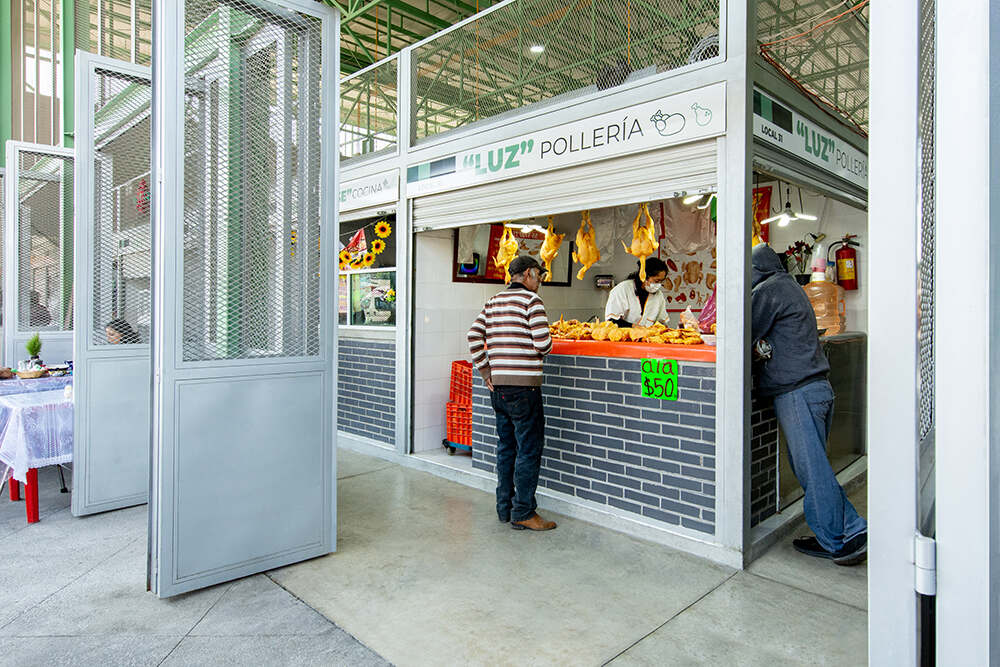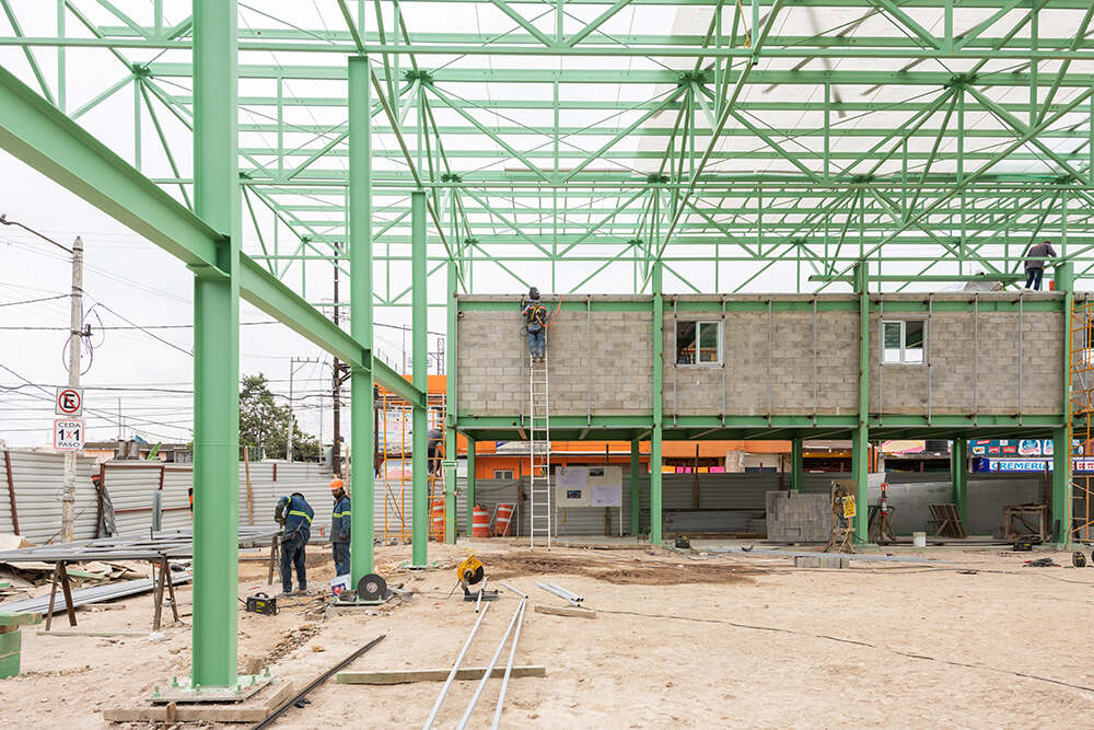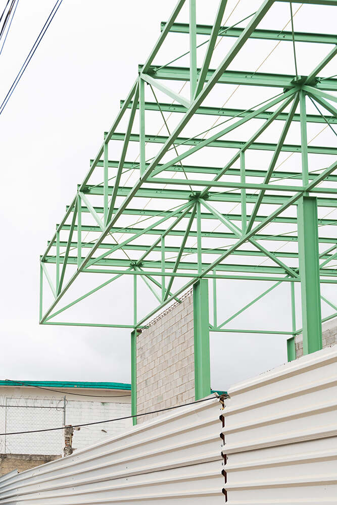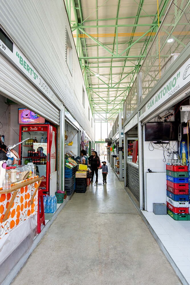 The main hall of the Mercado Municipal Mariano Escobedo—a 20m wide by 30m long column-free space—is capped by a 2.3-meter-high space frame that spans the length of the project site. This superstructure is supported by 28 perimeter steel columns that delineate the open market hall below. A total of 60 stalls are contained within the building, each one composed of a working counter, a sink, and an individual storage space. Vendors specialize in a wide range of products, selling fresh produce, meat, fish, dairy, baked goods, coffee, spices, and various specialty and prepared foods.