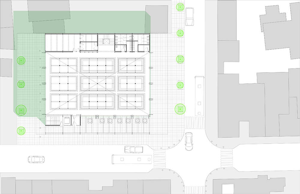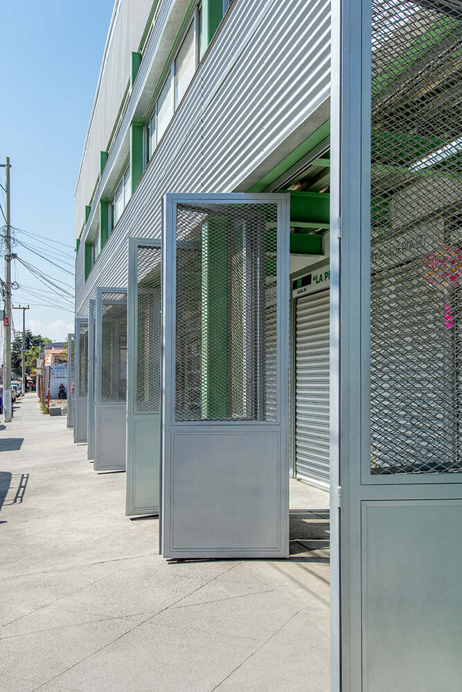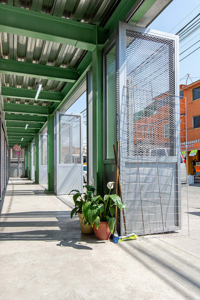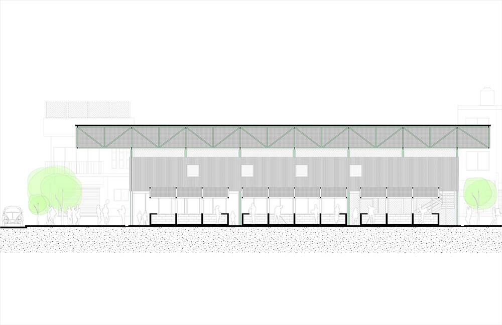 Además de la sala principal, dos barras programáticas delinean el perímetro del proyecto. La barra 1 se asienta en el piso y colinda con la secundaria vecina, ofreciendo programas públicos de soporte los cuales incluyen guardería, baños, y un área con mesas para comer. La barra 2 flota sobre el piso en el lado este del mercado, proporcionando un pórtico techado a nivel de piso mientras que contiene oficinas privadas del gobierno municipal en el primer piso. La cubierta del mercado vuela sin apoyos 5 metros sobre la fachada norte del edificio, brindando un espacio público cubierto en la intersección céntrica de las calles Mariano Escobedo y Juan de Dios Peza. Repleto de mesas, sillas de plástico, y bancas, este nuevo espacio de bolsillo urbano ofrece un espacio para sentarse a los usuarios y usuarias del mercado, jóvenes estudiantes, y transeúntes.