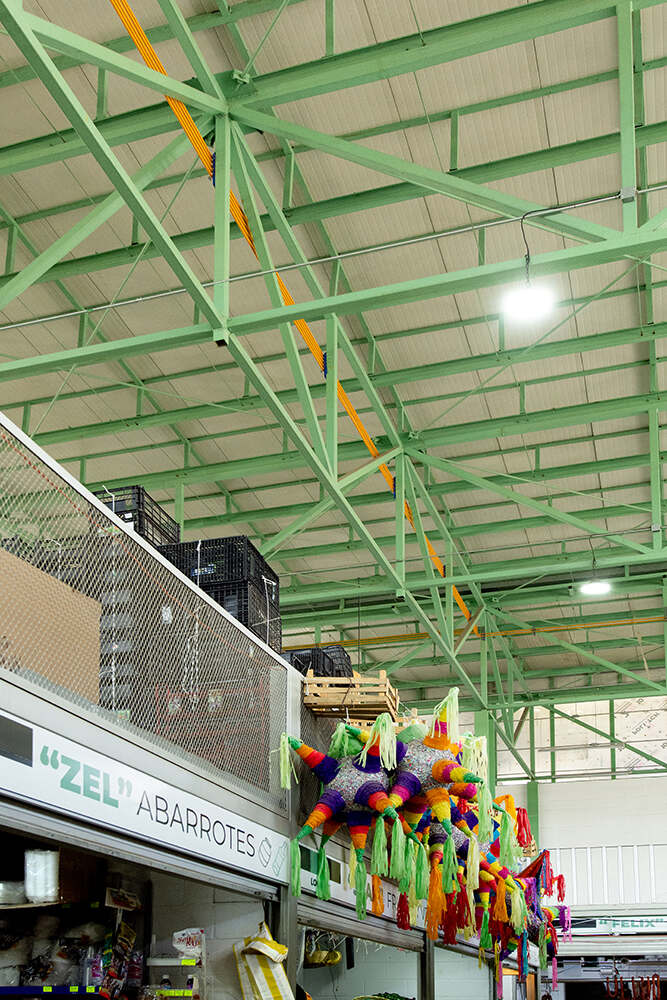 Responding to the limited dimensions of the site and a desire to increase the number of stalls for the benefit of market vendors and community members alike, the project pulls inspiration from spaces and typologies of mass commerce throughout Mexico. From the stalls of Mercado de la Merced and Tepito, commercial supermarkets, and big-box retail, the ceiling plane of these sites commonly acts as both roof and infrastructure, liberating space on the ground for the fluid movement of people and things.