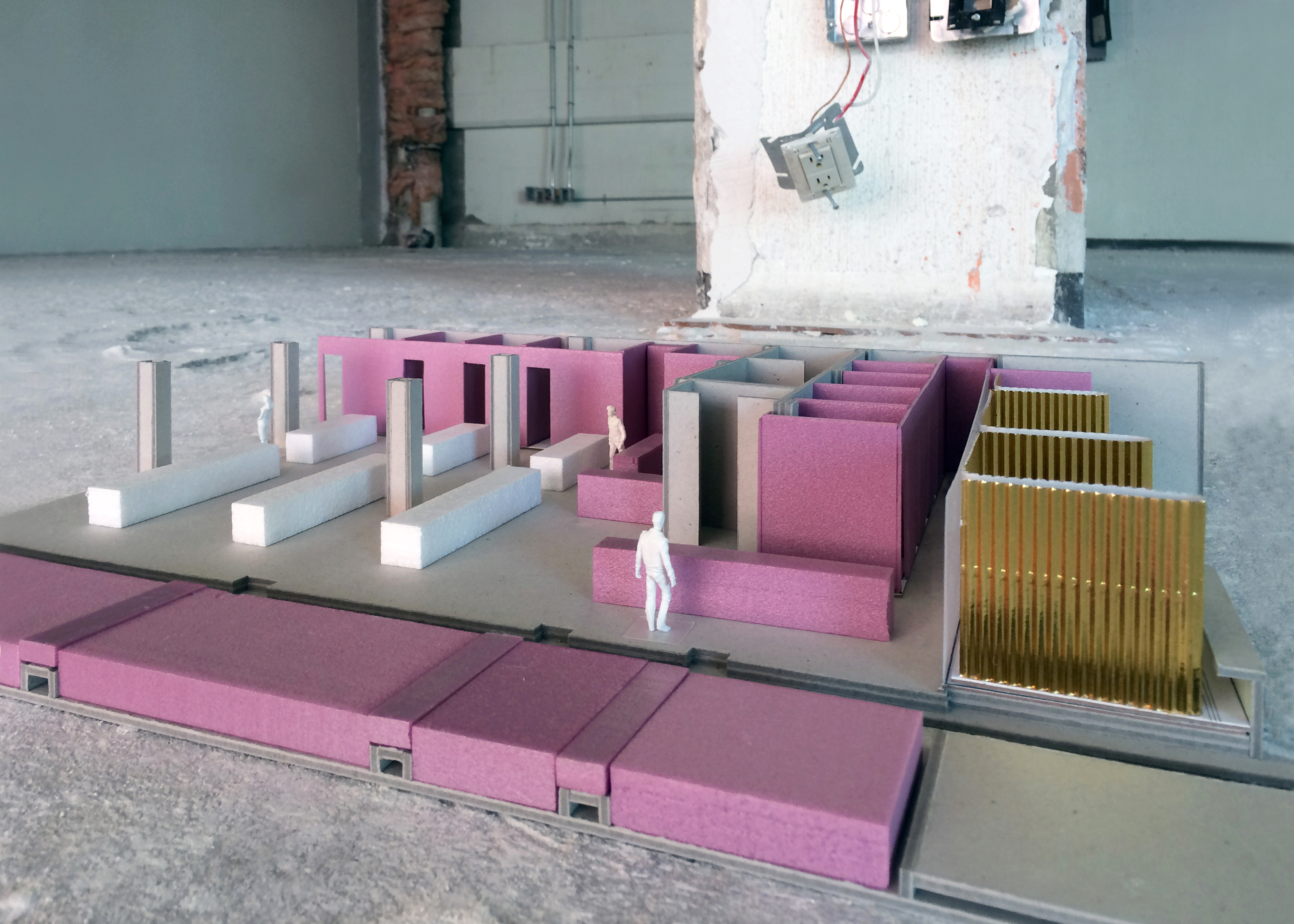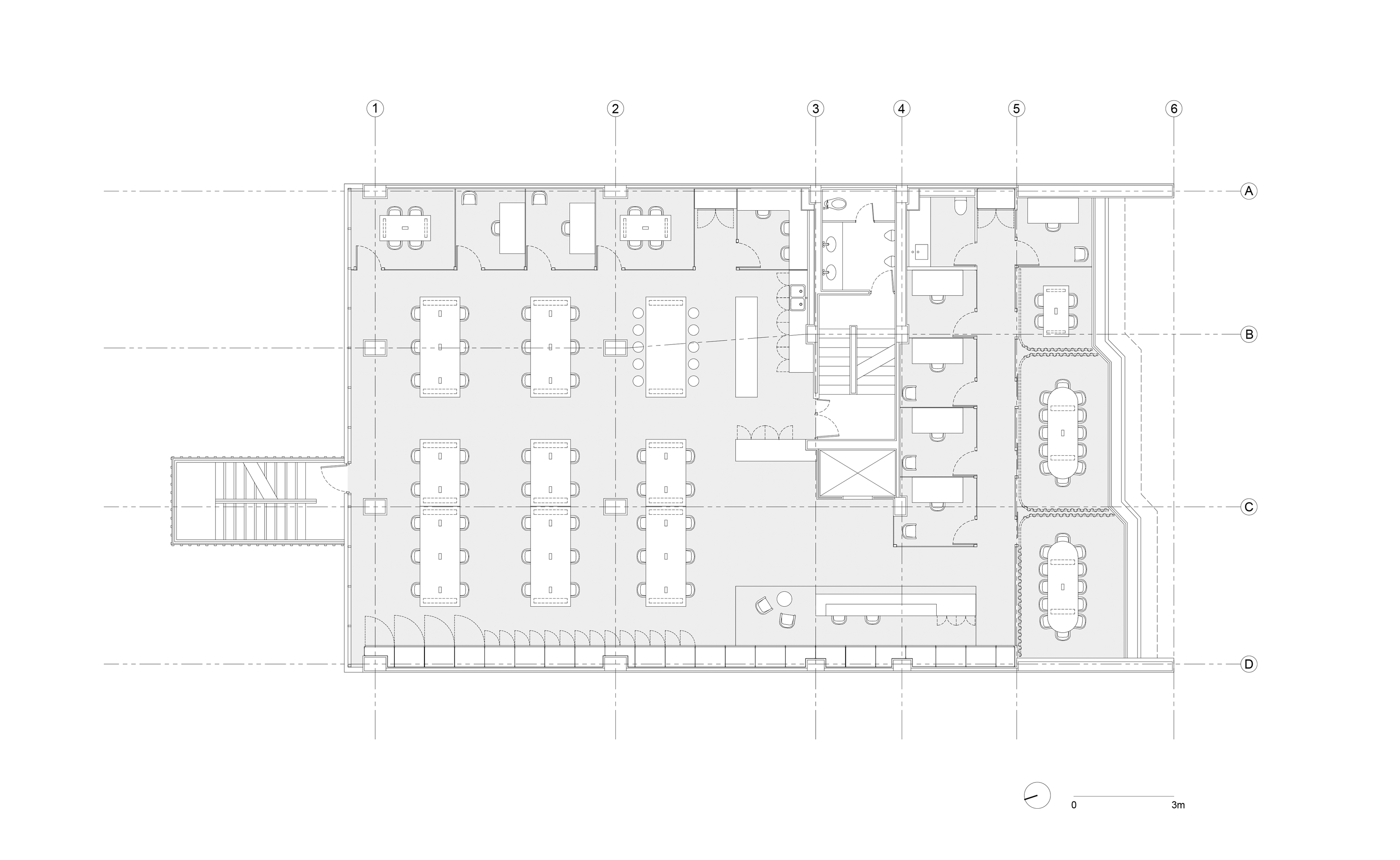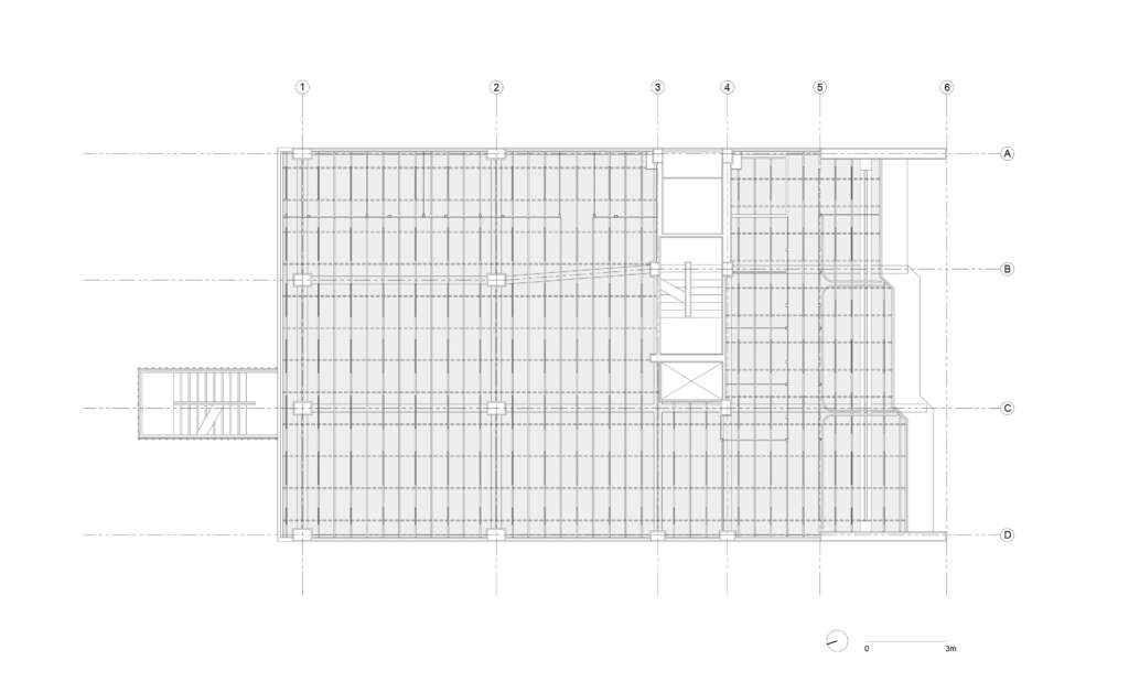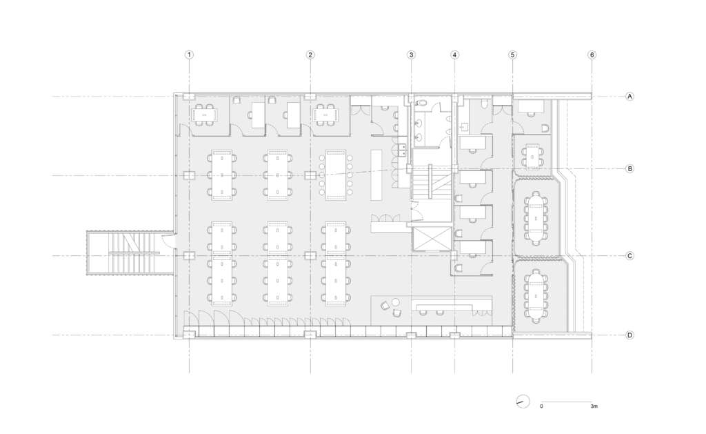 Los nuevos elementos programáticos son insertados por medio de una serie de barras lineales: las salas de juntas se alinean con la fachada principal; las oficinas privadas corren junto a los muros existentes; y la cocineta está dispuesta contra el core del edificio. El área restante fue dejada libre de particiones y es ocupada exclusivamente por seis mesas de trabajo de gran tamaño. Un módulo de 60 x 60 centímetros, obtenido de la retícula estructural preexistente, dicta la proporción y el ritmo de los elementos insertados. Además, dicho módulo organiza una serie de costillas lineales que componen el plafón abierto, el cual sostiene las luminarias y proporciona soporte a los sistemas de tecnología de las oficinas. Las vigas estructurales, el cableado, y el sistema de ductos son dejados aparentes, sirviendo como una suerte de exhibidor para el trabajo de la propia empresa.