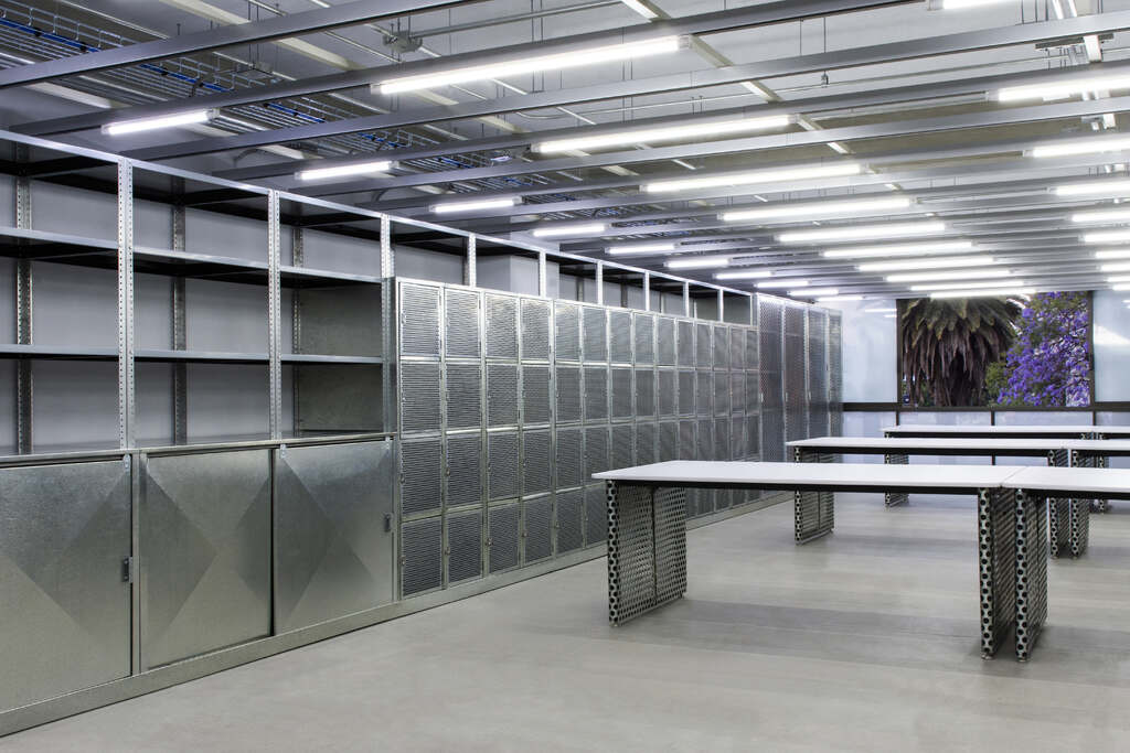 A la escala del detalle, se diseñó todo desde los acabados interiores hasta el mobiliario. Trabajando con una paleta de materiales compuesta por concreto aparente y aluminio pulido, el color y los patrones fueron introducidos en momentos específicos con el objetivo de resaltar actividades especiales. El terrazo verde con motas de granito negro, blanco y rosa fue utilizado en las barras de trabajo de la cocineta y del baño privado. Las cortinas color amarillo brillante proporcionan flexibilidad operativa a las salas de juntas en la fachada principal del edificio. Suspendidas de una serie de rieles, las cortinas permiten subdividir el espacio en tres distintas salas de juntas o ser completamente abiertas para crear una sola sala de conferencias. La lámina metálica lisa y multiperforada es utilizada para recubrir el mueble de recepción, las mesas de trabajo, y el mueble de guardado principal, en el cual cada empleado cuenta con un casillero donde poder almacenar artículos personales y equipo de trabajo.