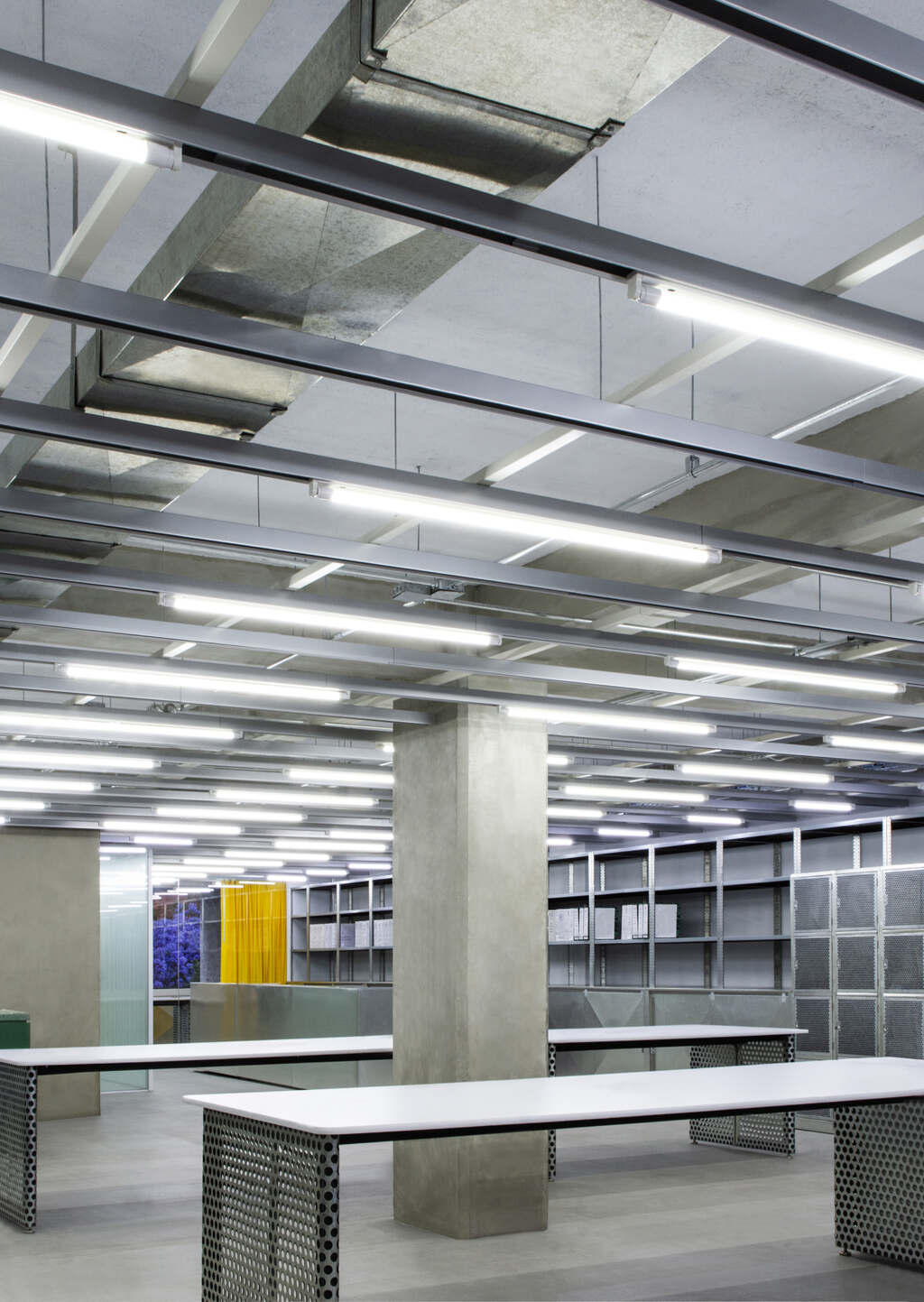 At the detail level, custom interior finishes and furniture were developed for the project. Working within a primary material palate of raw concrete and polished aluminum, color and pattern were introduced at point-specific moments to designate special programs. Green terrazzo flecked with black, white and rose granite form the working surfaces of the staff kitchen and private bathroom. Vibrant yellow curtains provide operational flexibility for meeting spaces at the front façade. Suspended from a series of tracks, they can be positioned to subdivide space into three separate meeting areas or pulled back to create one large conference room. Perforated steel sheets are used for the reception desk, working tables, and main storage unit, where each employee has a private locker for personal items and work equipment.