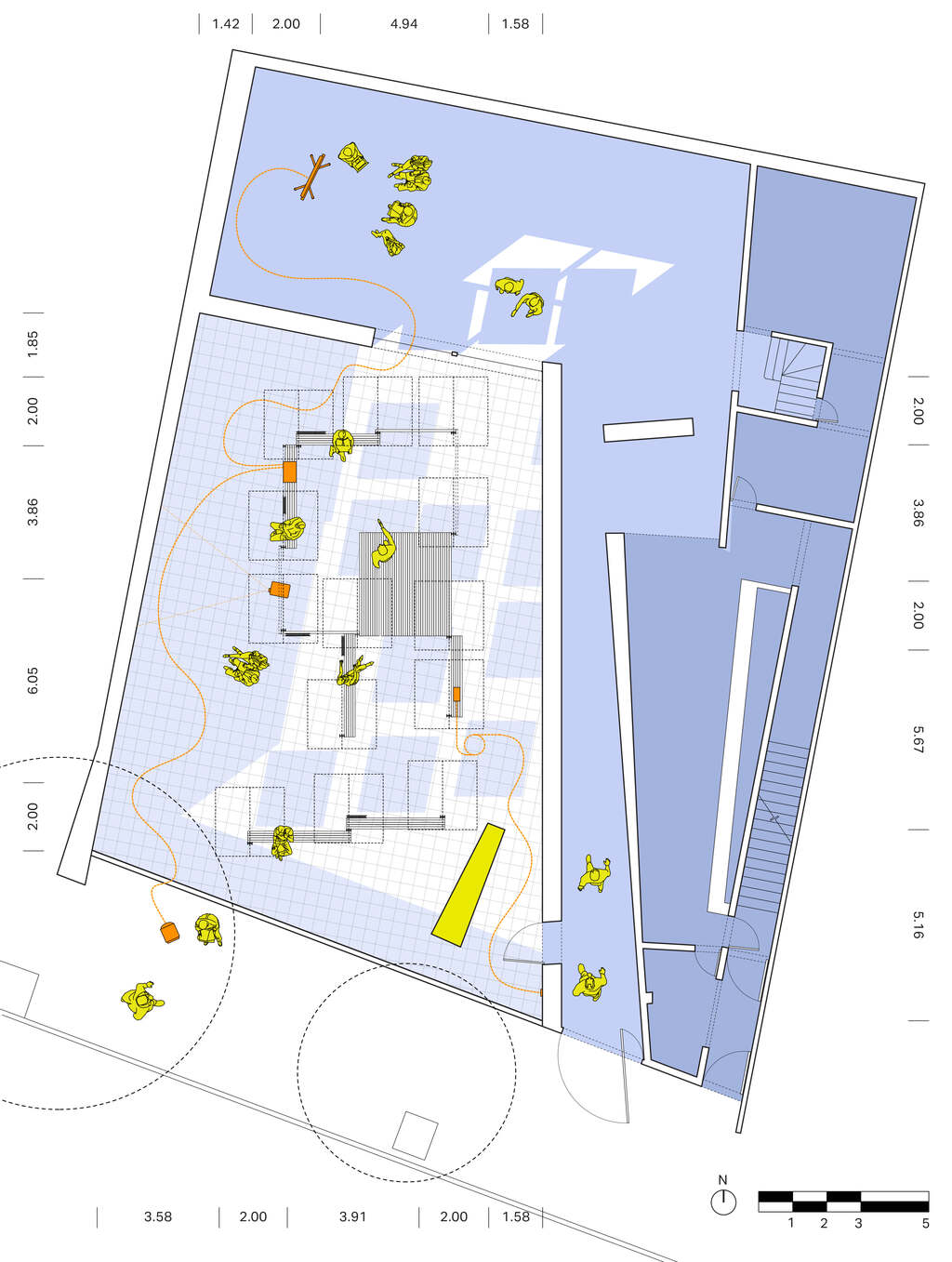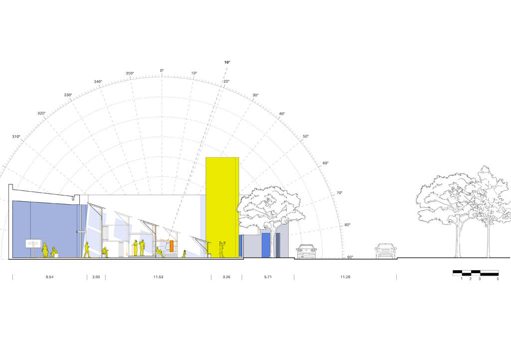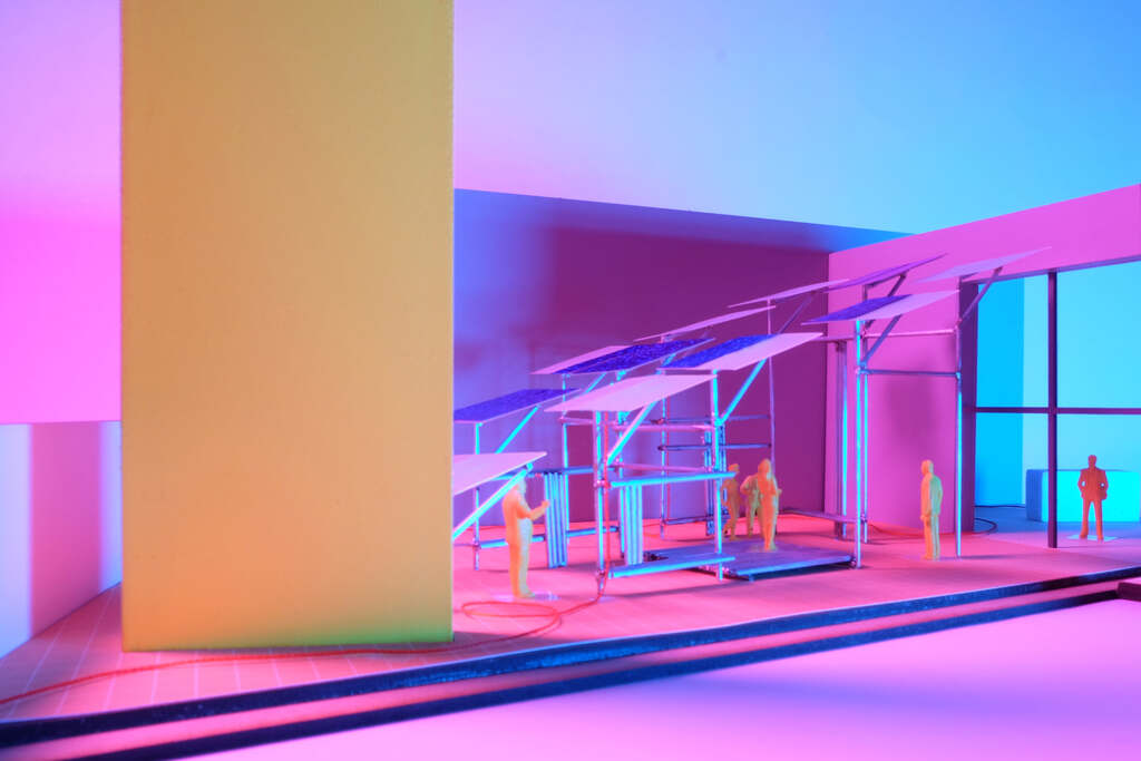 In response, Prototipo Eco is conceived of as a device that generates a product. The substructure is composed of industrial aluminum posts that form seating areas and low platforms, while the technological surface that hovers above is composed of photovoltaic and polycarbonate panels. Linking directly to the existing electrical circuit of the Museo Experimental El Eco, the pavilion provides sufficient energy for the museum’s operation while inserting new discourses into the patio both formally and conceptually.